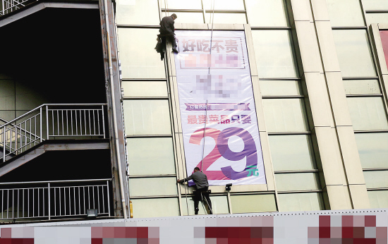 前天,在市区江北一建筑的外立面,两名师傅正在三层楼高的外墙上悬挂广告牌。他们的身上除了用绳子固定,没有其他安全措施,很让人为他们的安全担心。