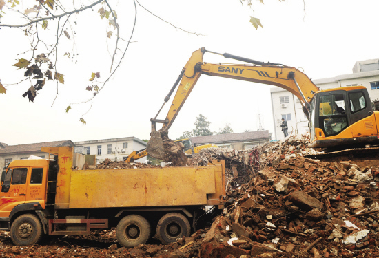 12月12日,在市区二七区块拆迁改造工地现场,大面积的房屋被推倒之后,清理建筑垃圾工作正在紧张进行。据了解,这些建筑垃圾目前主要用来填路,以及经过破碎、粉磨等处理变成水泥原料。