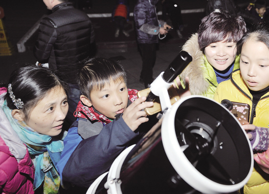 12月18日晚,月明星稀,十几架天文望远镜架在金华市青少年宫门前的大广场上。当天,由金华市青少年宫组织的观月活动吸引了50多名小学生参加,他们在父母和老师的指导下,学习使用天文望远镜,了解月亮和地球之间的关系。