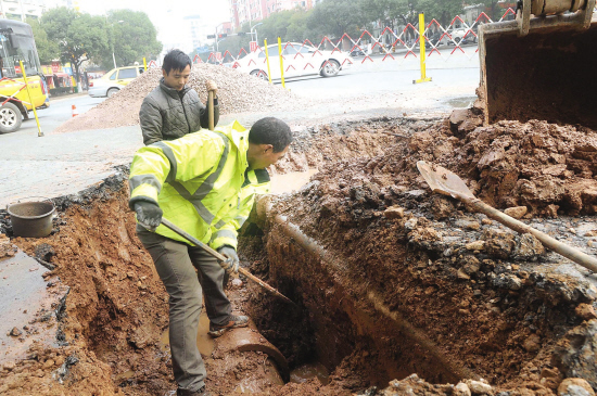 昨天,金华市区人民西路与凤山街交叉口,市自来水公司维修人员在抢修供水主管线,此处已被挖出一个直径1米多的大坑。维修人员说,市区一些供水主管道已运营10多年了。每年冬天,受气温影响,管道都会有伸缩,极易引发供水管道爆裂,出现漏水情况。