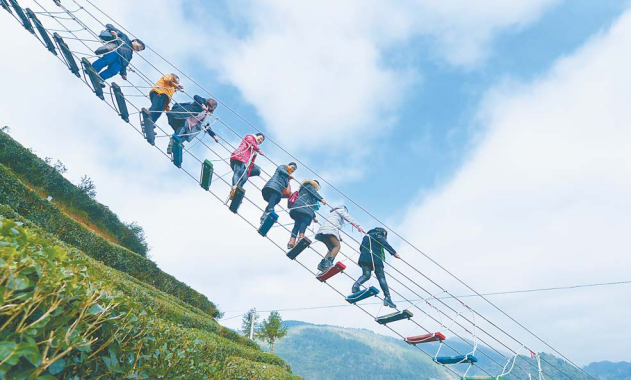 冬日暖阳下,湖北省恩施土家族苗族自治州宣恩县伍家台村的有机茶园游人如织,惊险刺激的空中观光通道吸引游客纷纷前往体验。