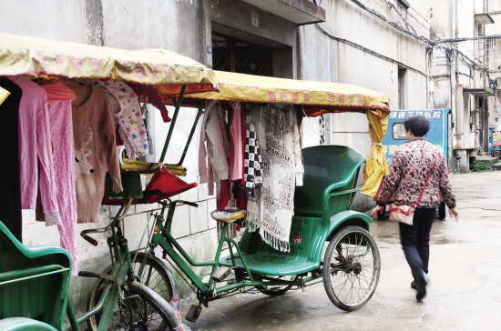 昨天,市区中村路上弄堂一旁停了五六辆黄色三轮车,上面晒了很多衣物,不太雅观。住在附近的王师傅说,一些三轮车车主暂住在这里,因黄色三轮车车主逢单号休息,恰逢下雨没地方晒衣服,才会在三轮车上晒起衣物。