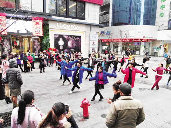 昨天中午,市区西市街上舞曲突然响起,一群年轻人快速跳起舞来,动感十足。数分钟后,他们又在附近人行天桥再次舞动。这些人是市区某舞馆的学员,寒冷冬日在街头跳舞,使街区平添一份活力。