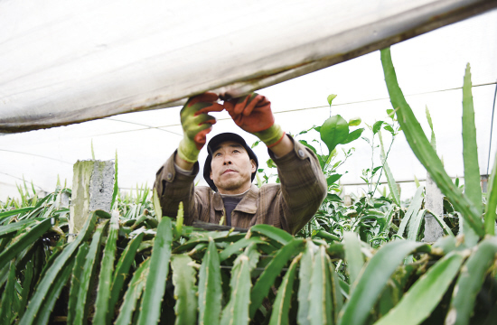 昨日上午,在金东区塘雅镇前溪边村晓玉火龙果园内,村民检查大棚薄膜密封性,以应对雨雪冰冻天气的到来。